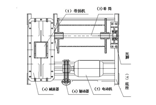 本結(jié)構(gòu)采用行星齒輪傳動方式,通過聯(lián)軸器直接帶動卷筒轉(zhuǎn)動,并可簡易更換報(bào)廢鋼絲繩或改變鋼絲繩旋轉(zhuǎn)方向。制動機(jī)構(gòu)